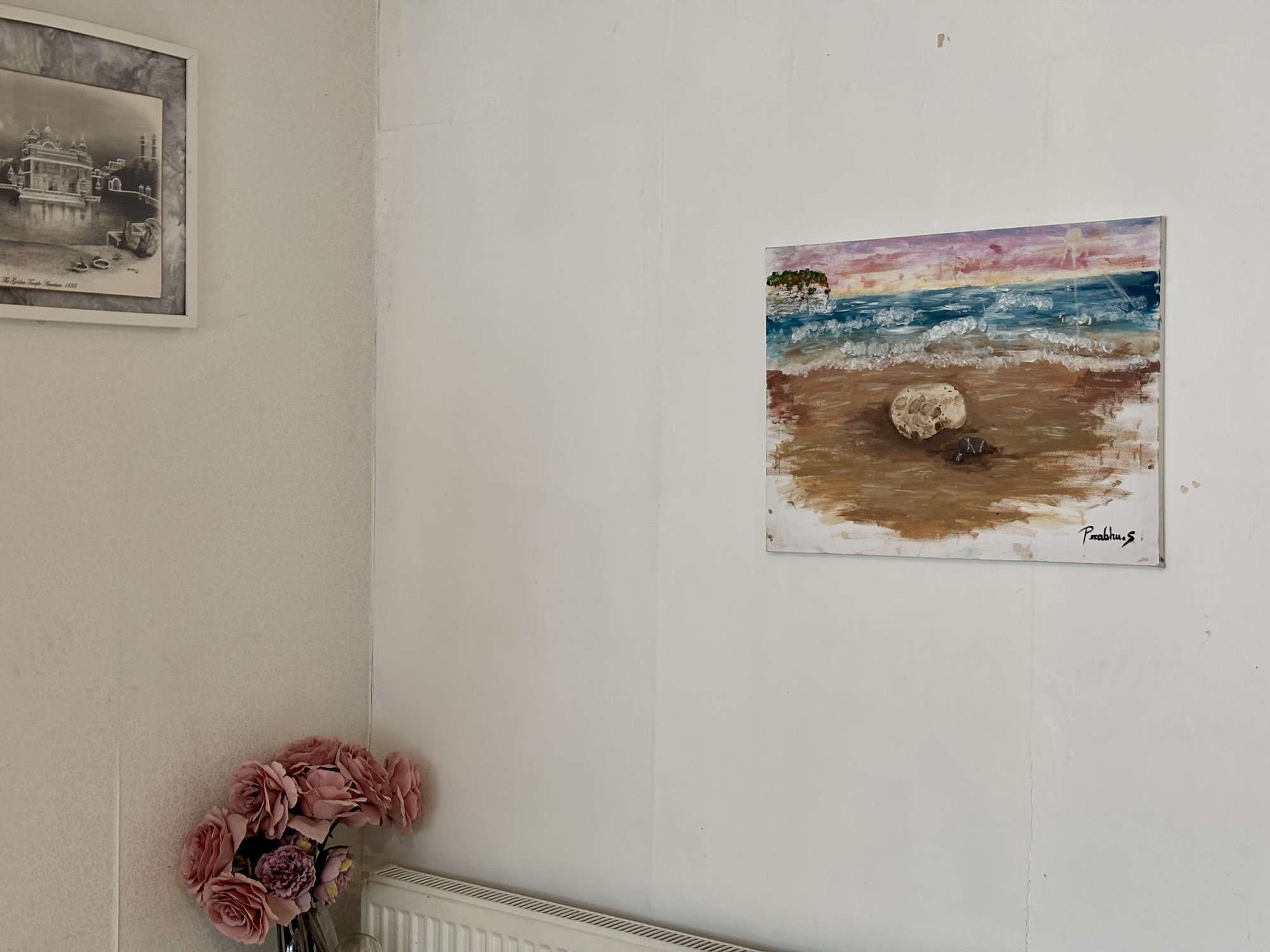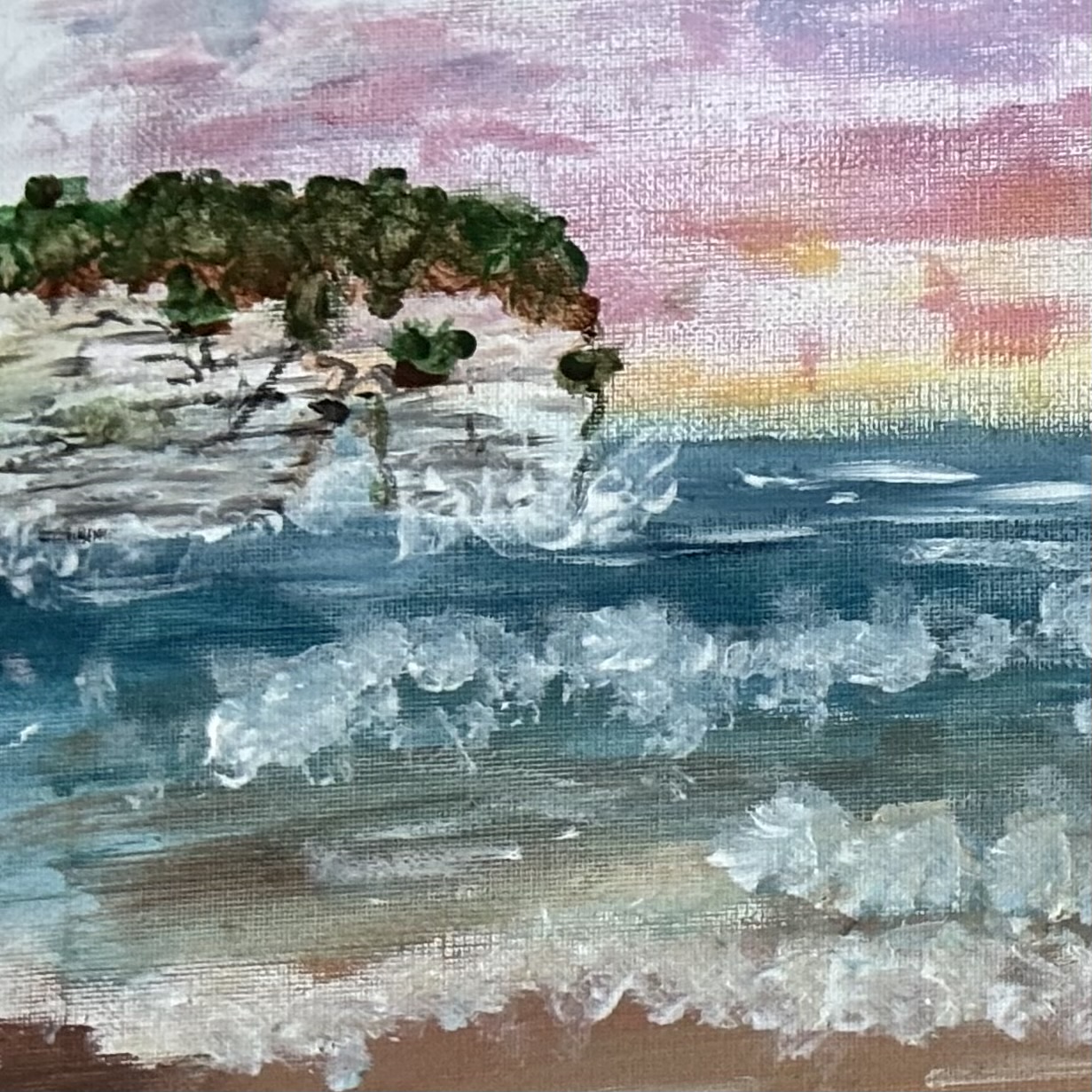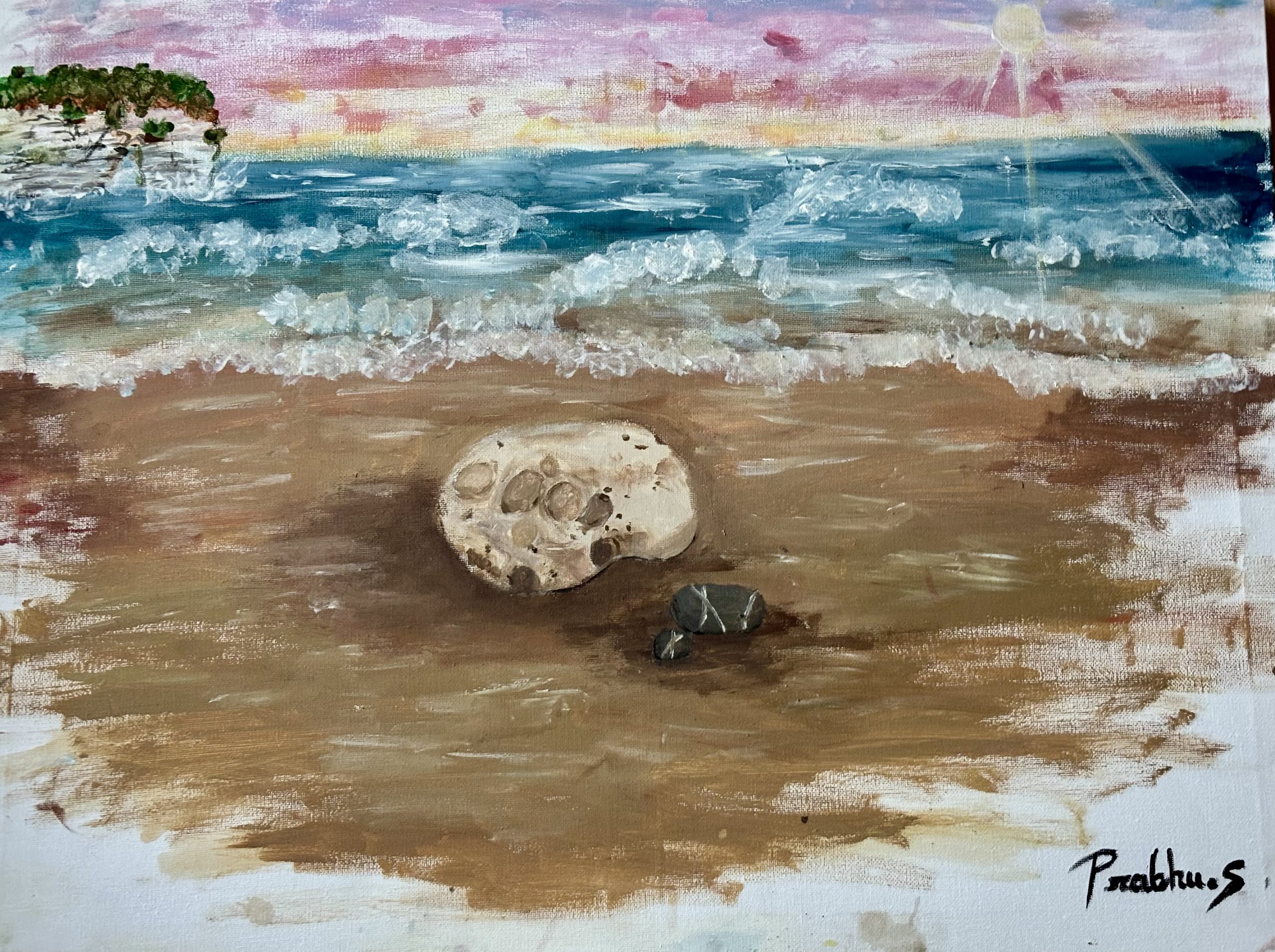 I painted this after visiting Flamborough beach this year (July 2025), and it was the inspiration for this imagined painting. The rock and the lovely formations on it, were actually found at that beach, though.